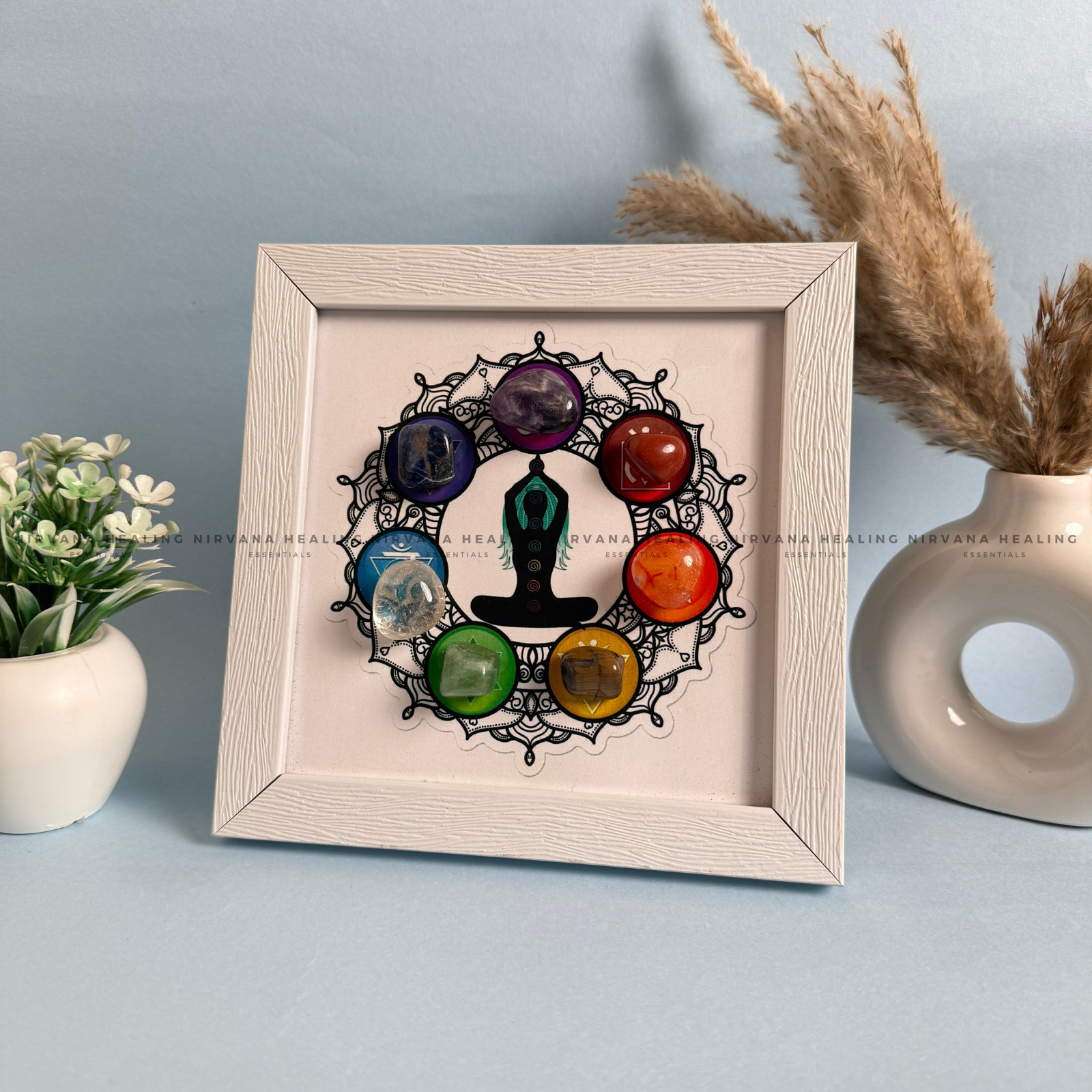 The Seven Chakra Healing Tumble Frame is a powerful energy-balancing décor designed to harmonize the mind, body, and soul. Crafted with carefully selected natural crystal tumbles, each stone represents one of the seven chakras, working together to restore balance, remove blockages, and elevate the vibration of your space.