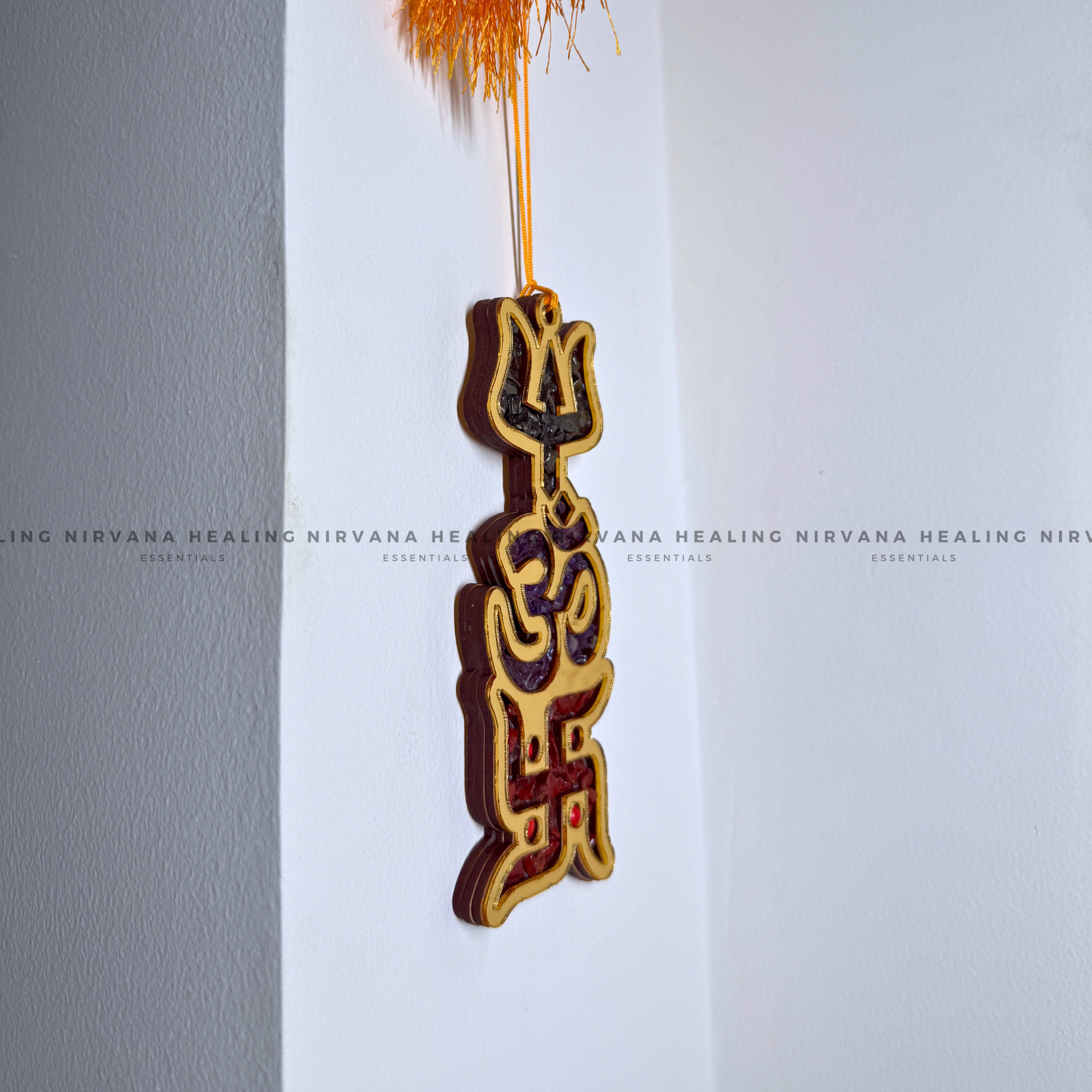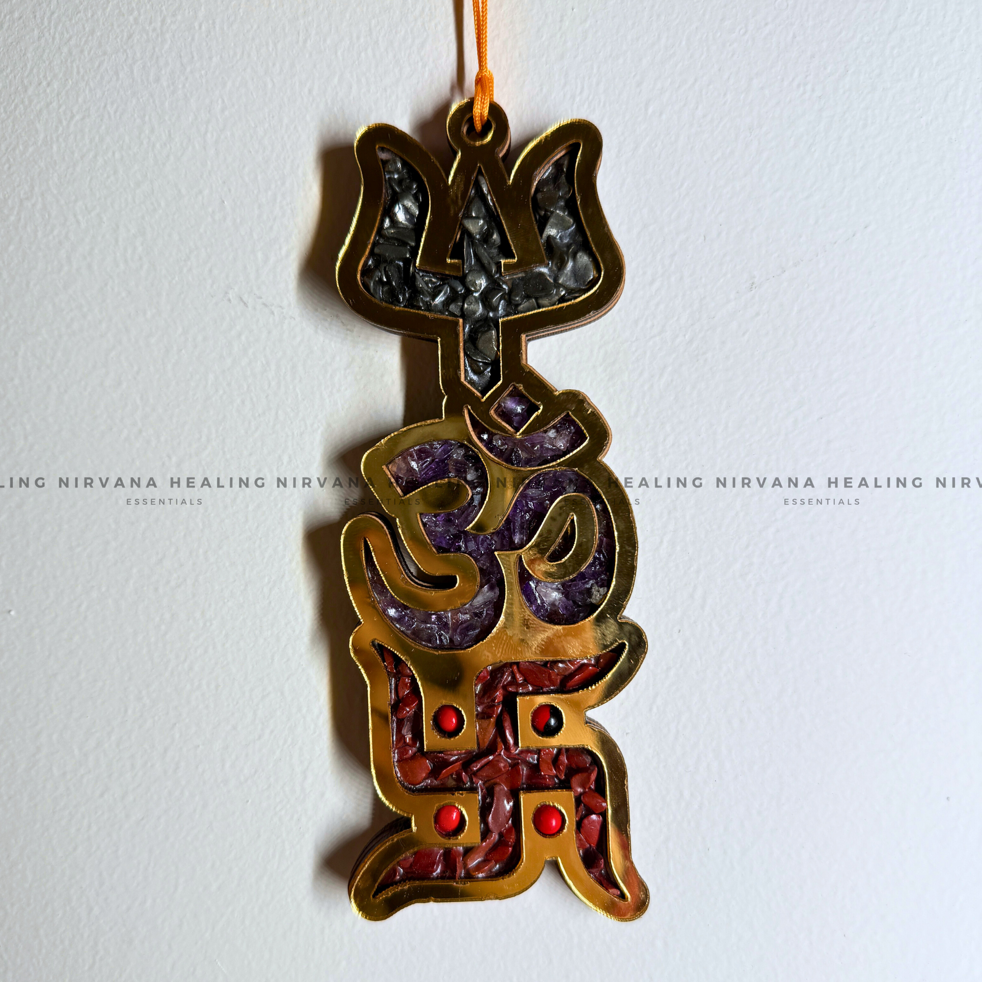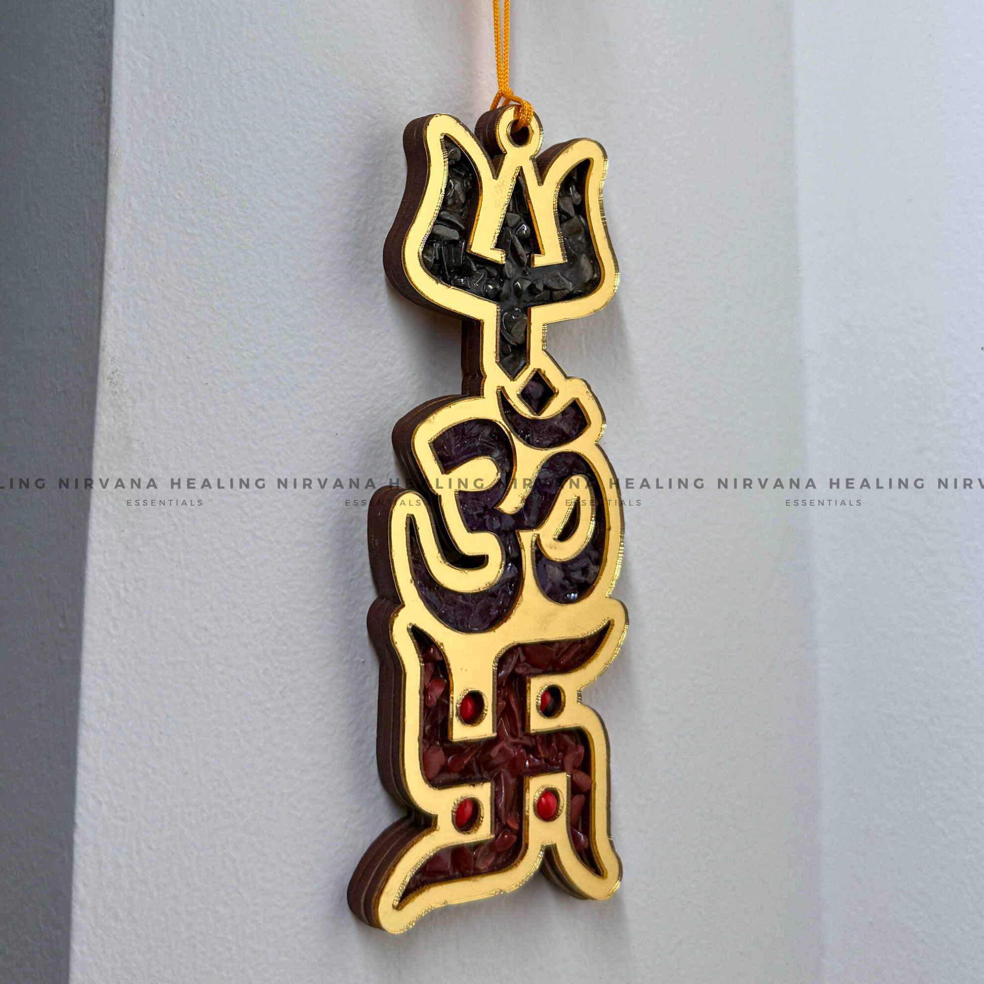 The Trishakti Yantra with Natural Crystal Chips unites the power of Trishul, Om, and Swastik to protect from negativity, attract abundance, and bring peace. Enhanced with crystal energy, it amplifies positivity, prosperity, and divine blessings—perfect for your home, office, or meditation space.