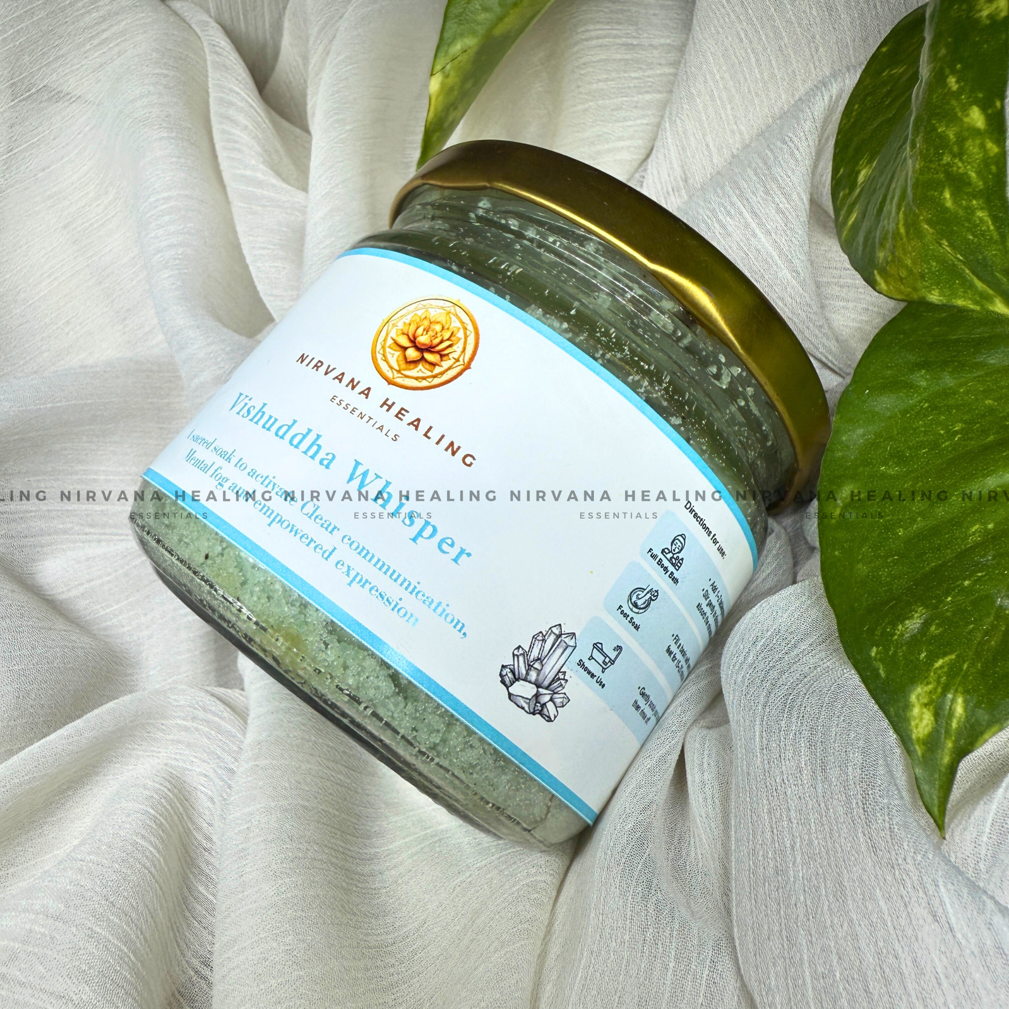 Immerse yourself in the soothing embrace of Vishuddha Whisper, a crystal-infused bath salt designed to awaken your voice, clear your mind, and inspire authentic self-expression. Rooted in the energy of the Vishuddha (Throat) Chakra, this blend works to release blockages, calm inner tension, and bring clarity to your thoughts and words.